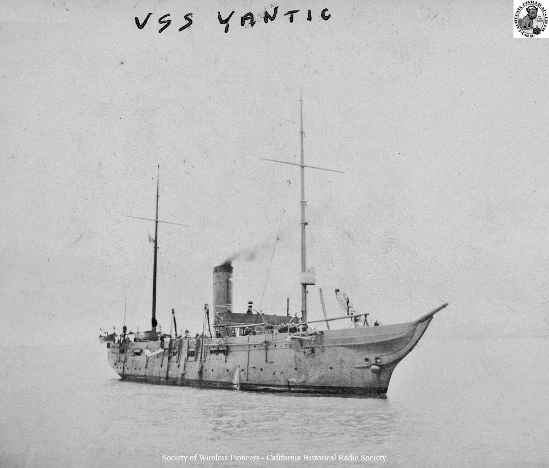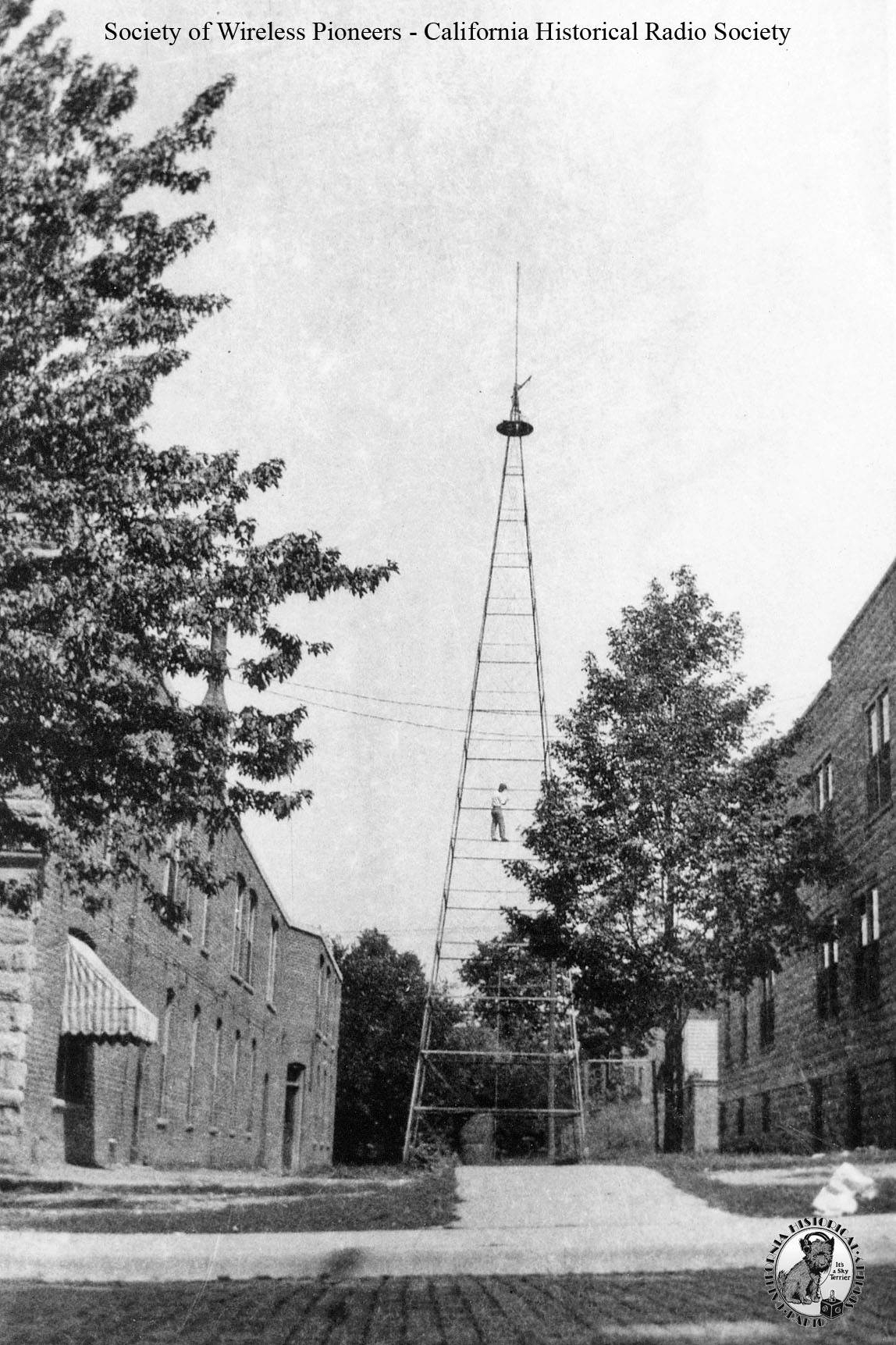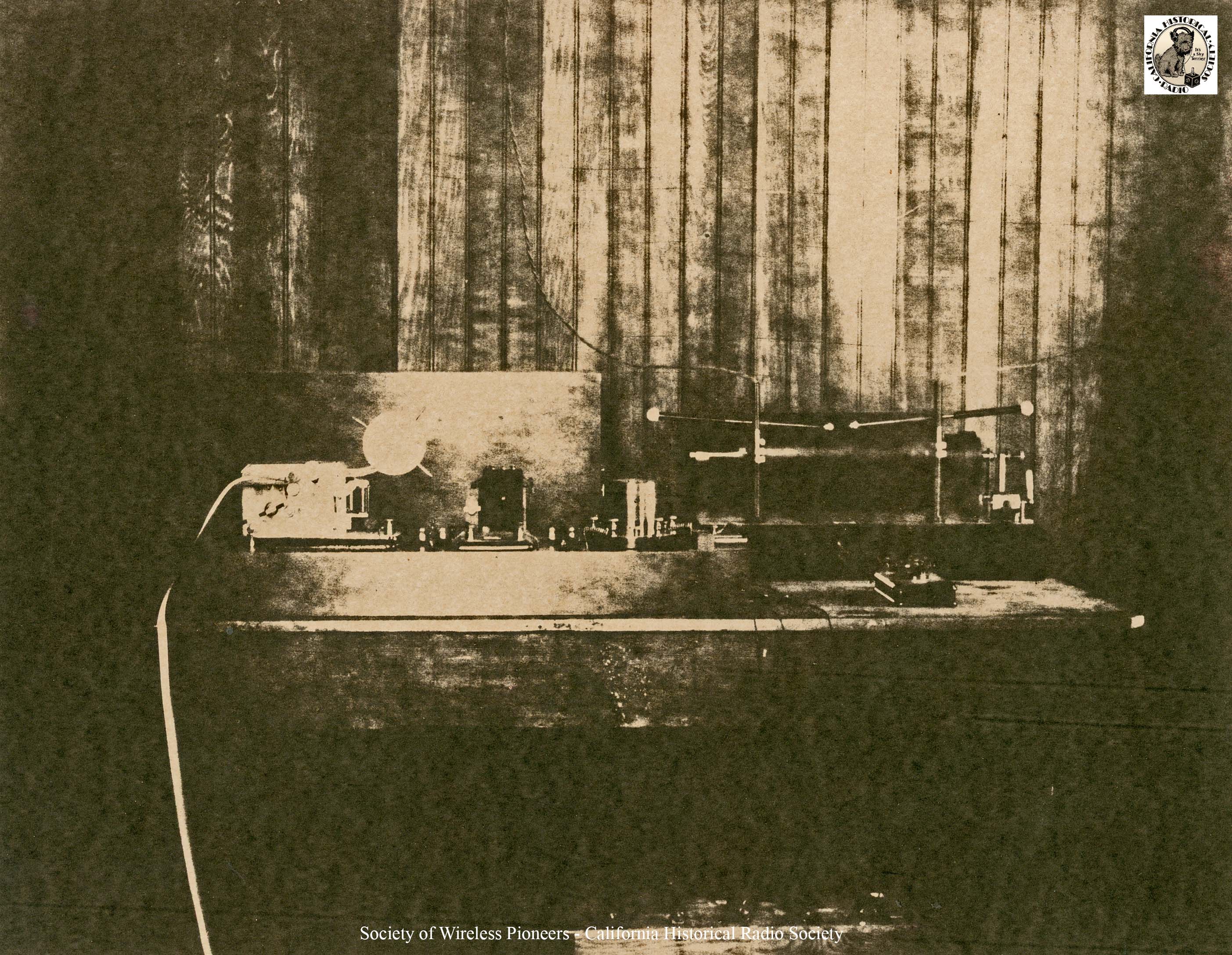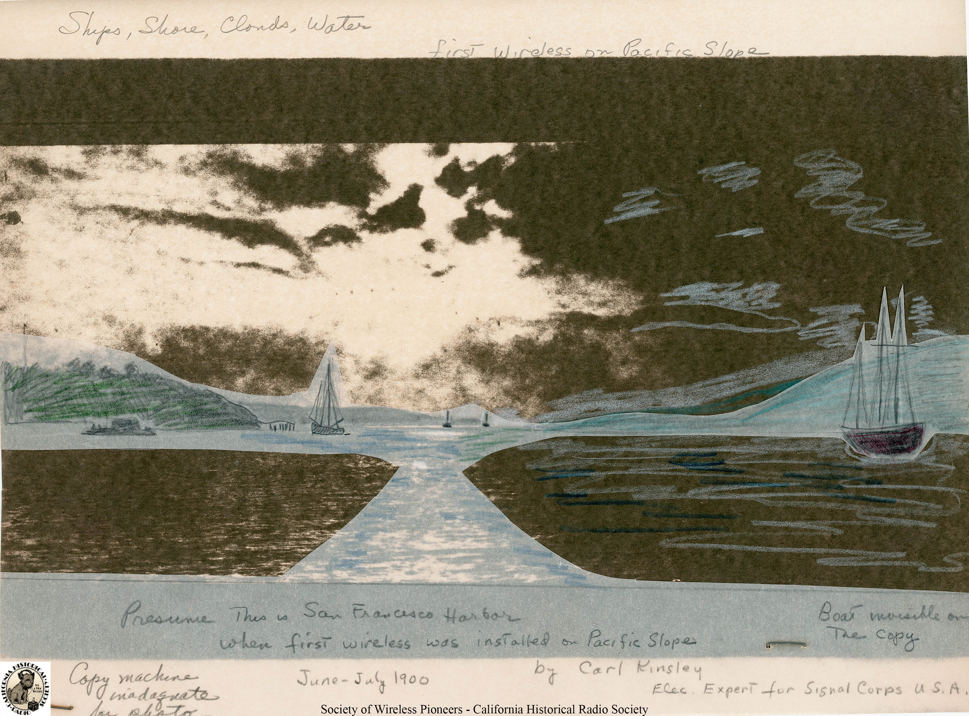 The photo below, presumably taken by Carl Kinsley when he established the first wireless telegraphy link on the Pacific Coast in 1900, is actually a photocopy of Kinsley’s original photo with visual enhancements and notes likely by his daughter, Colony Kinsley Parrott.