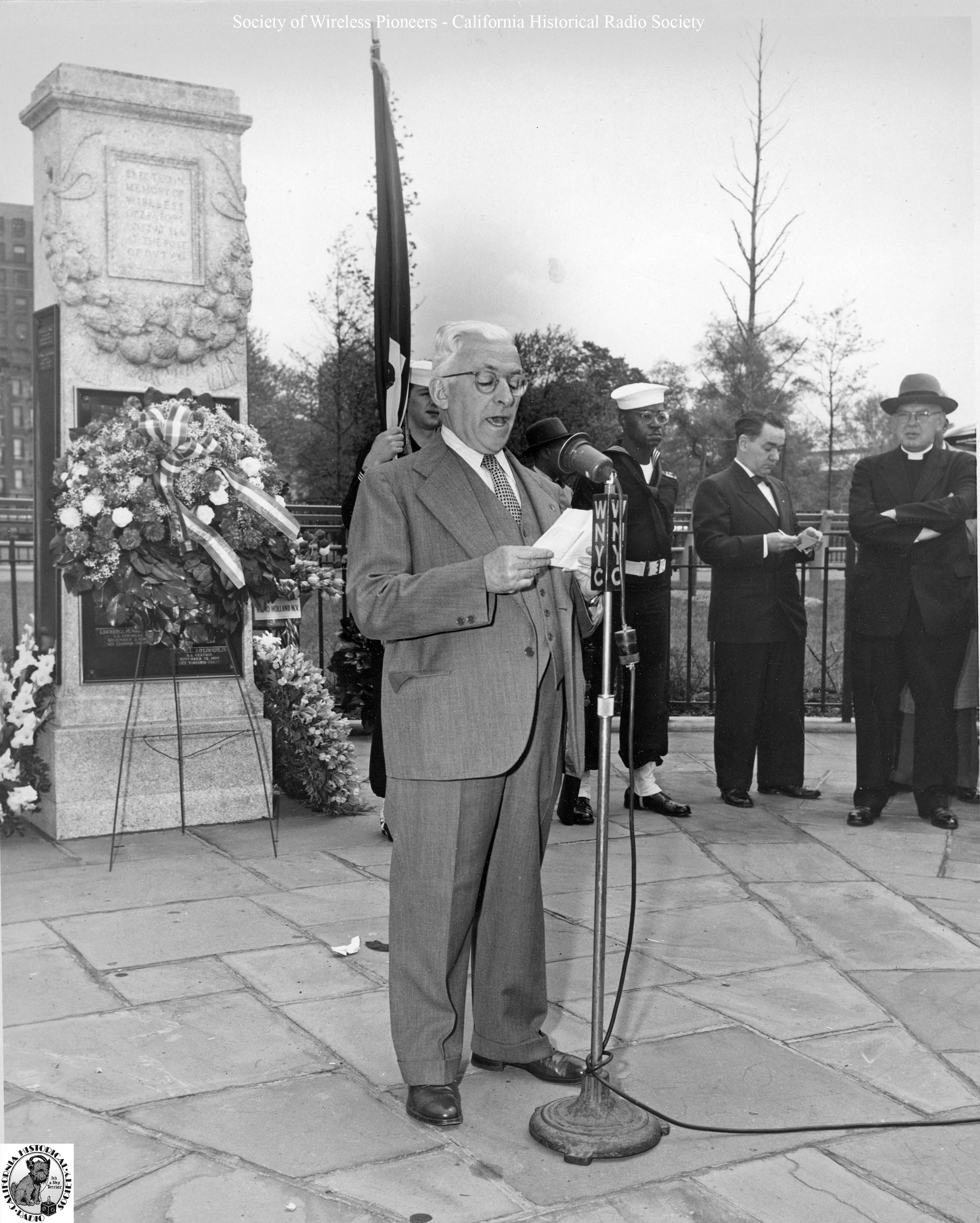 Ben Beckerman speaks at the re-dedication of the Wireless Operators Memorial in Battery Park, May 12, 1954