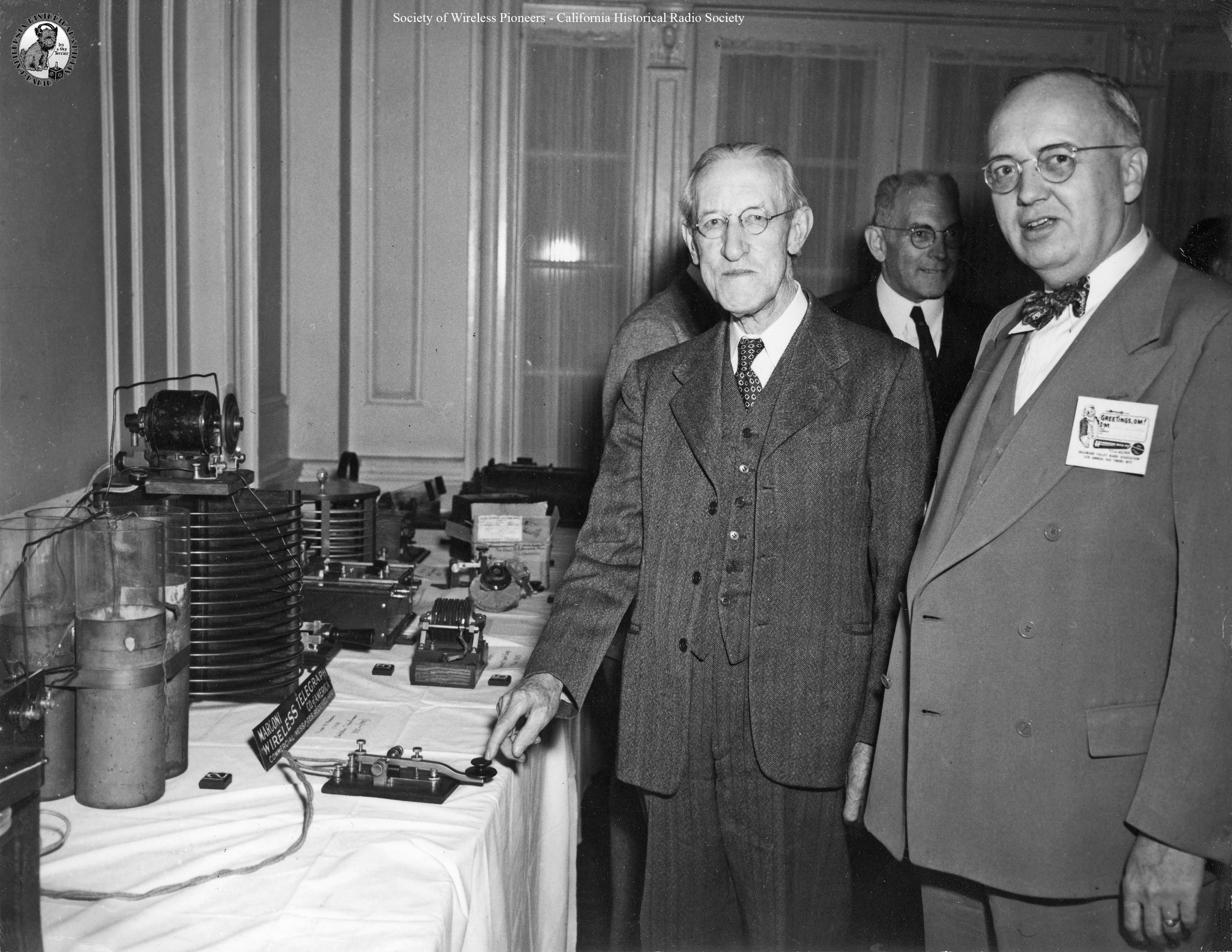 McCarty Wireless Telephone System at the 1925 Pacific Radio Expo, with Ignatius McCarty at Right