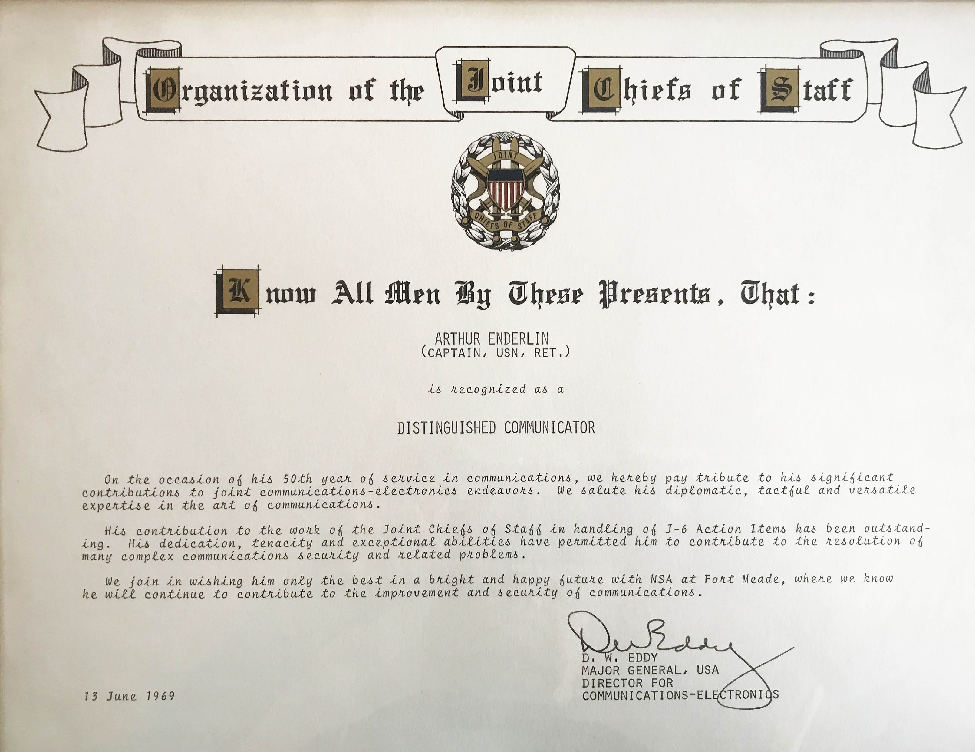 Even after his official retirement in 1962 the cryptology community and the US government did not want to see him go. He became a civilian Defense Department consultant for several more years. Although his experience had begun in the days of spark and arc, Enderlin was an impressively forward-looking thinker. A 1970 memo he wrote entitled “Why Digital?” argues for the implementation of digital technology at a time when most experts were still committed to analog transmission methods. He correctly predicting that aside from the advantages of easier encryption, with the use of timesharing and digital transmissions by narrow-bandwidth methods such as satellite, costs would soon be less than those of the older method. We haven’t asked the NSA, but it seems safe to assume that they ended up taking his advice. His professional service was recognized by many citations including an award from the Joint Chiefs of Staff.