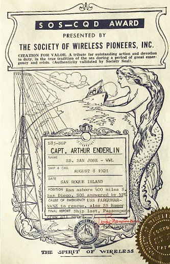 Arthur Enderlin was proud to be a member of the Society of Wireless Pioneers, and in the early 1970s he even presented a series of talks at their Washington D.C. chapter meeting that, tongue-in-cheek, he called “The Saga of Arthur Enderlin”. Much to our regret, we have found no notes, slides, or recordings of these presentations so far. But thanks to his daughter, we do have a photo of another award he received, this one from SoWP commemorating his wireless service when the SS San Jose ran aground 400 miles south of San Diego in 1921. His SOS summoned two US Navy destroyers and all lives were saved, though the ship could not be.