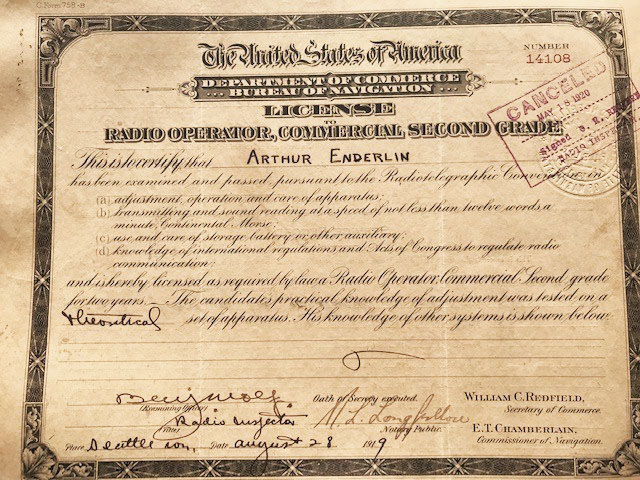 By the age of 16 Enderlin had developed a good “fist” for Morse code, and would go on to win speed and accuracy awards. In 1919 he received his first commercial “ticket” and soon went to sea as a radio operator on ships (the first being the SS Aspenhill) sailing to Central America, Europe, and Asia.